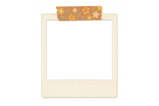 Instant film frame with floral patterned tape, creating a vintage scrapbook aesthetic for memories, transparent background