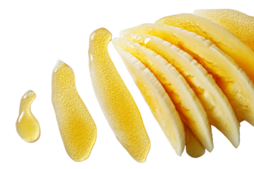 A golden waffle with banana, strawberries, and drizzled chocolate, presented in an artistic top-view composition, soft lighting, transparent background