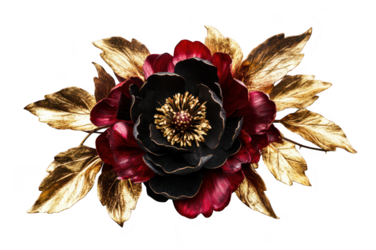 A stunning arrangement of a black and burgundy flower with golden leaves. set against a clean white background. perfect for decorative purposes or artistic displays