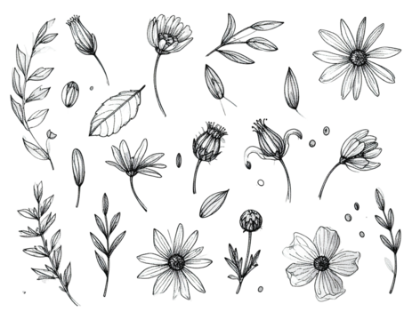 Hand-drawn botanical illustration with flowers, leaves, and buds, in grayscale on a black background