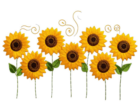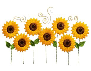 Digitally enhanced image depicts an arrangement of sunflowers against a stark black background