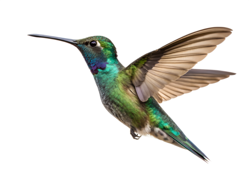 Vibrant hummingbird isolated on transparent background, in flight with wings spread, showcasing detailed plumage and colorful iridescent feathers