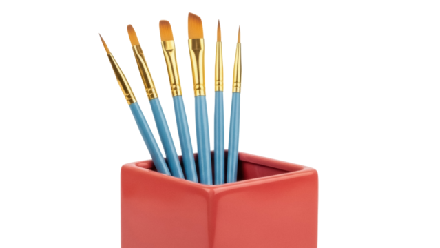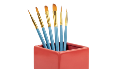 Isolated studio shot of artistic paintbrushes in a square coral container, art supplies