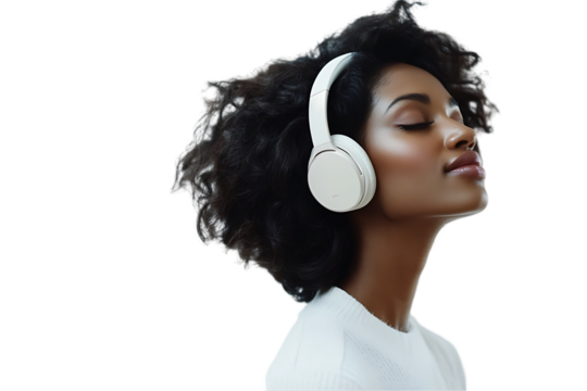A woman enjoying music with headphones, lost in her thoughts.