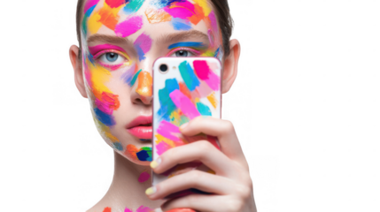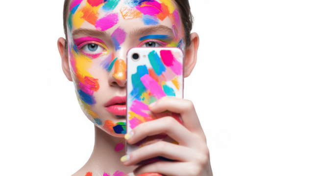 Woman with vibrant, artistic makeup covering her face takes a selfie with her phone, which also features a matching colorful design, against a transparent background, creating a striking visual