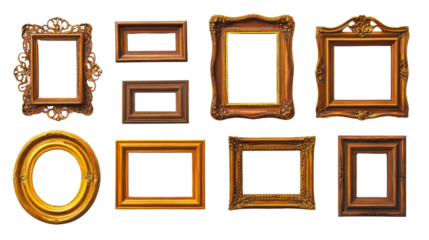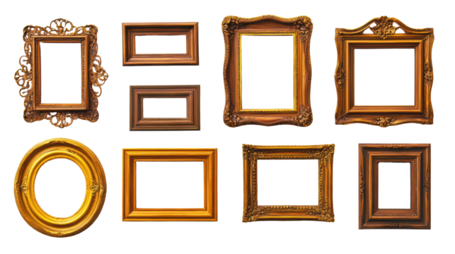 Three ornate gilded picture frames offer artistic presentation with isolated transparent background
