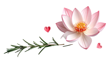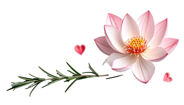 Delicate floral illustration features a lotus, rosemary, and hearts against black