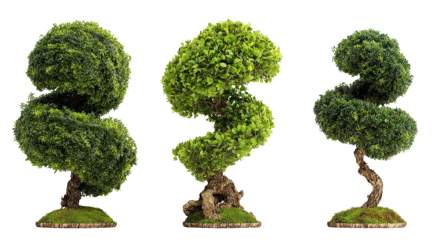 Artistic botanical presentation showcases three verdant topiary trees styled in serpentine