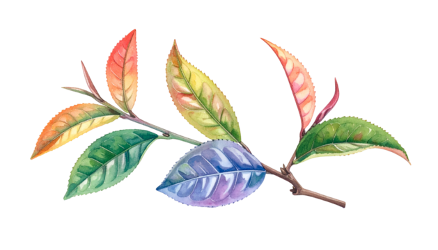Watercolor illustration of a branch with vibrant leaves in various colorful hues