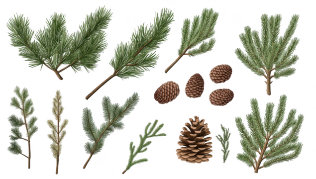 A collection of various pine branches and pine cones arranged artistically on a white background. the natural beauty of evergreen foliage and textures. ideal for seasonal decor or design projects