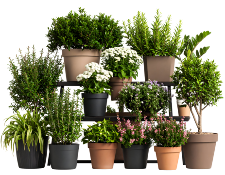 A vibrant display of various potted plants arranged artistically on shelves showcasing greenery and blooms.