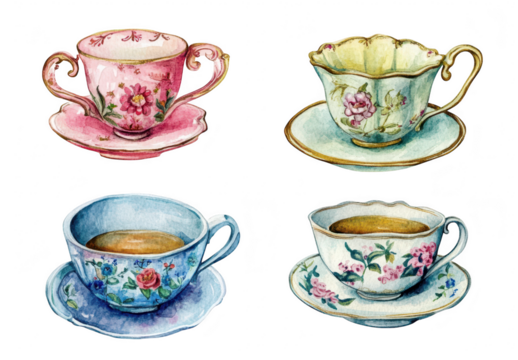 A collection of four beautifully designed vintage teacups. each with unique floral patterns and delicate saucers. arranged artistically against a clean white background. perfect for tea lovers and hom