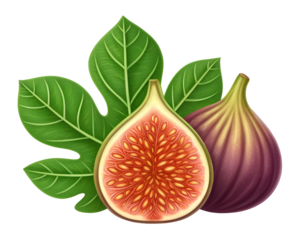 Realistic watercolor illustration of ripe fig fruit with lush green leaves, painted in soft hues for a fresh organic aesthetic.