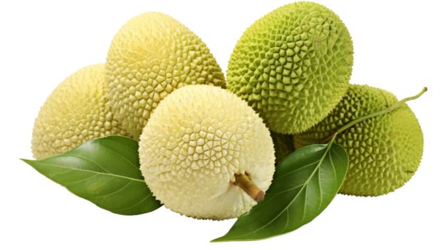 Marang fruit with textured skin and green leaves, isolated on white transparent background. Concept of tropical fruits.