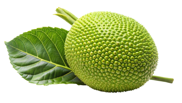 Isolated breadfruit with its vibrant green leaf showcasing the bumpy texture