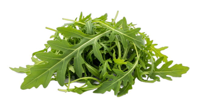 A fresh pile of vibrant green arugula salad leaves isolated on a clean transparent background png.