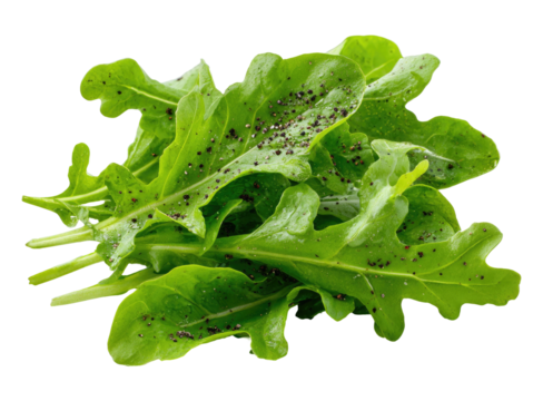 Fresh arugula leaves, vivid green, sprinkled with dark speckles