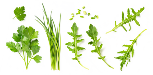 set / collection of fresh Mediterranean herbs: parsley, chives and arugula leaves and chopped pieces isolated over a transparent background, herbal food and cooking design elements, top view/flat lay