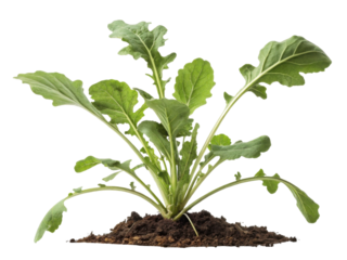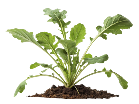 Fresh arugula plant growing in rich soil showcases vibrant green leaves and healthy appearance, perfect for salads and garnishes