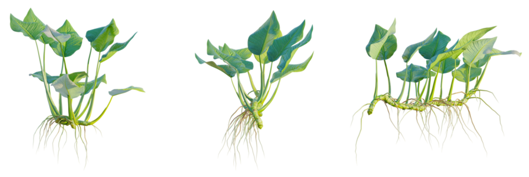 Anubias barter tree, font view, elevation, cutout, isolate, transparent background, Vibrant arum plants with roots, ideal for botanical studies and decorative use
