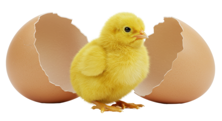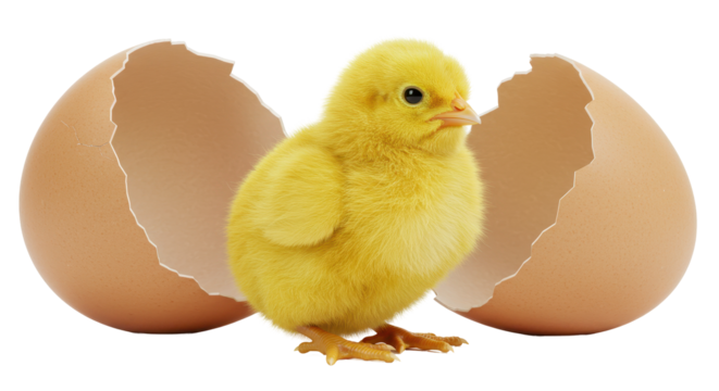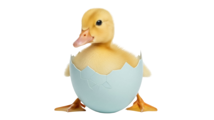 Adorable yellow duckling hatching from a blue egg isolated PNG, cute baby bird on transparent background