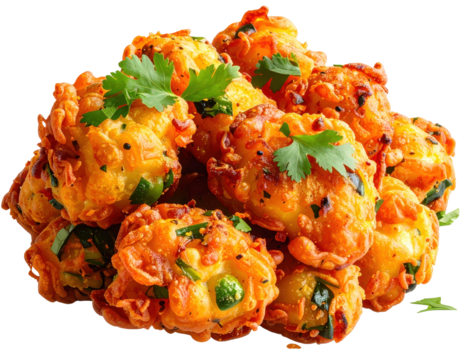 Golden potato pakoras with cilantro garnish, crispy fried indian snack on white background