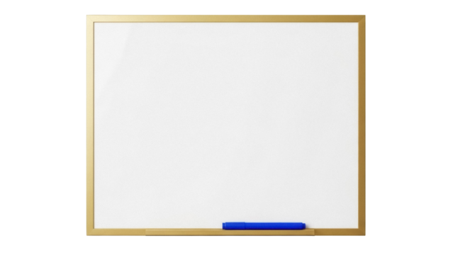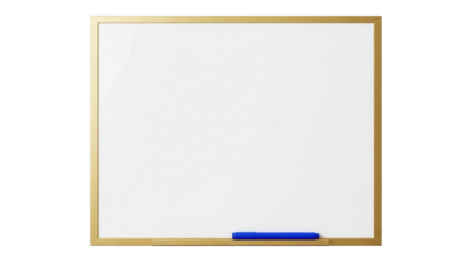Blank whiteboard with blue marker isolated PNG, empty writing board for presentations and teaching on transparent background