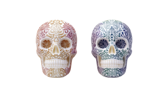 Three vibrantly decorated sugar skulls with intricate patterns and floral designs against a black background