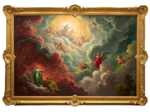 Celestial ascension with angelic figures amidst dramatic clouds isolated on a transparent background
