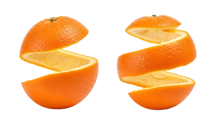 Two peeled oranges with segments separated in a spiral shape isolated on a transparent background orange segments