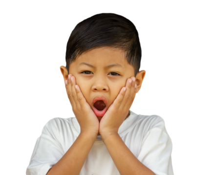 Portrait of surprised asia child ,close up kid surprised and hands near open mouth