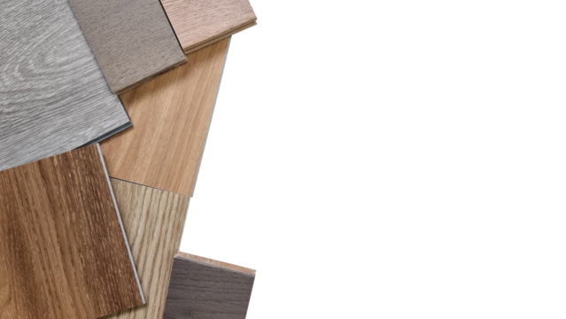 interior material samples including ash vinyl flooring, oak ash and italian walnut engineered flooring, beige and grey fabric interior wallpaper isolated on background with clipping path.