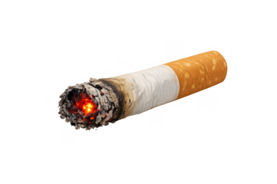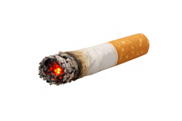 Burning cigarette showing glowing embers, ash, and an orange filter, a symbol of nicotine addiction and health risks, transparent background