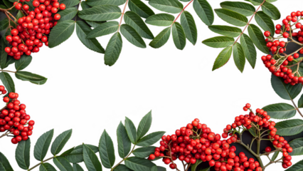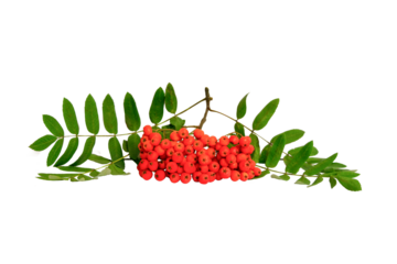Autumn branch of red rowan berry with green rowan leaves isolated on white background