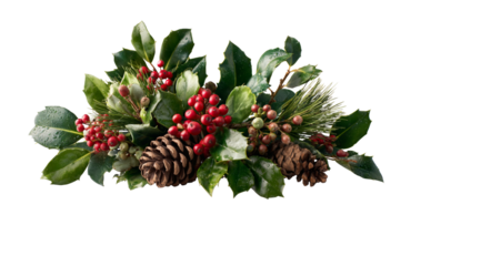Christmas floral arrangement with holly, mistletoe, and pine cones, isolated on a white background