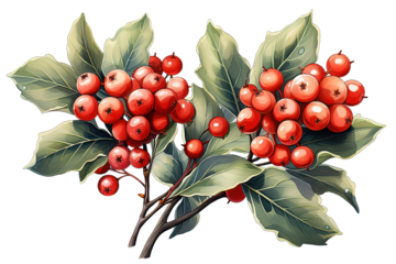 Christmas colorful watercolor twig with green leaves and red berries isolated on PNG Background. Generative Ai.