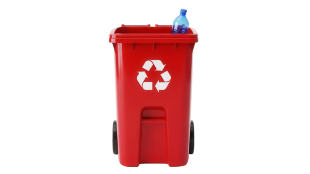 Red recycling bin with blue plastic bottle isolated PNG, waste management and environmental conservation concept on transparent background