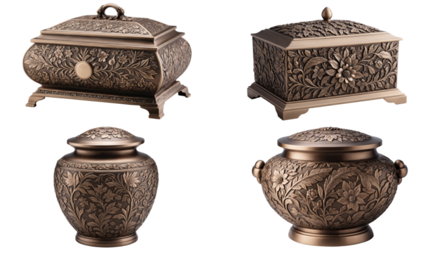 Four elegant urns for ashes, intricately designed with floral patterns, warm bronze finish, isolated on transparent background PNG