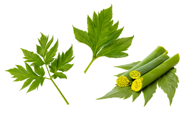 Close up of Angelica keiskei Ashitaba vibrant green plant with lush foliage healthy botanical shot for herbal cosmetic or food industry marketing on transparent background