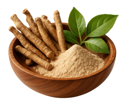 Ashwagandha roots powder leaves wooden bowl image, Isolated, Png Transparent Background