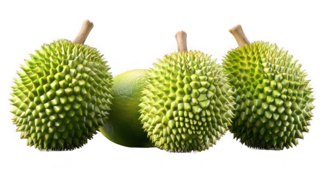 Three durian fruits with spiky green shells and a green lime isolated on a black background