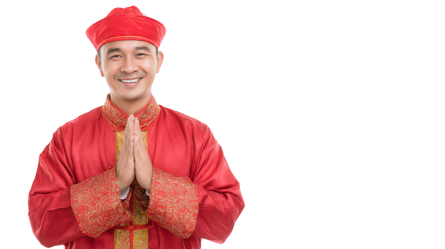 Chinese New Year greeting gesture by Asian man in traditional outfit celebrating lunar festival with cultural respect festive happiness holiday tradit