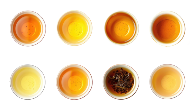 Eight small bowls of tea, various colors and stages of brewing in isolated on transparent background