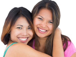 Two smiling asian sisters embracing on transparent background