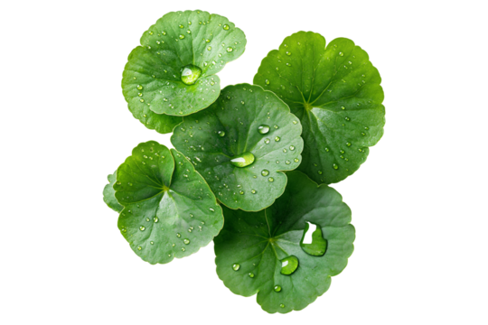 Green Centella Asiatica Foliage with Fresh Water Drops Isolated on Transparent Background