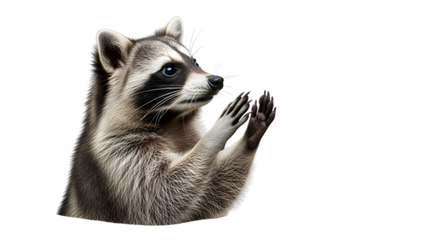 Raccoon raising hands and pleading with paws up isolated on white background.