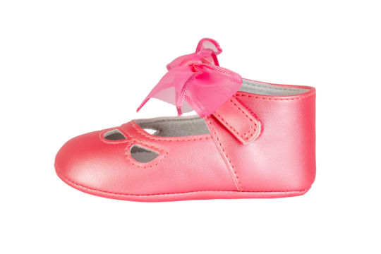 Close-up of pink baby shoe, presented on a transparent background. The image is simple, drawing all focus to the tiny, delicate footwear.  Perfect for use in projects related to baby products.