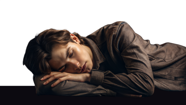 Person feeling tired and sleepy resting on a pillow with a transparent background