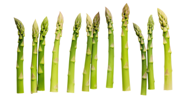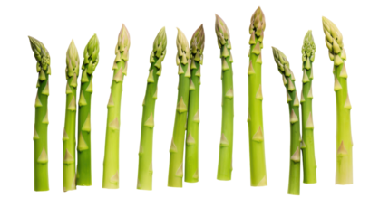 Green asparagus spears standing vertically, highlighting slender stalks and pointed tips against clean, clear background