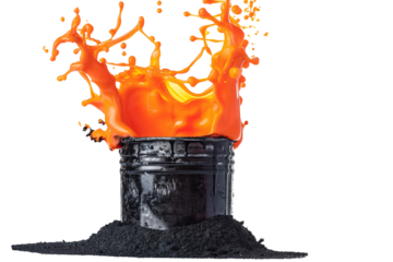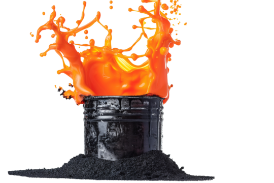 Hot asphalt splashes in a black bucket isolated on a transparent background